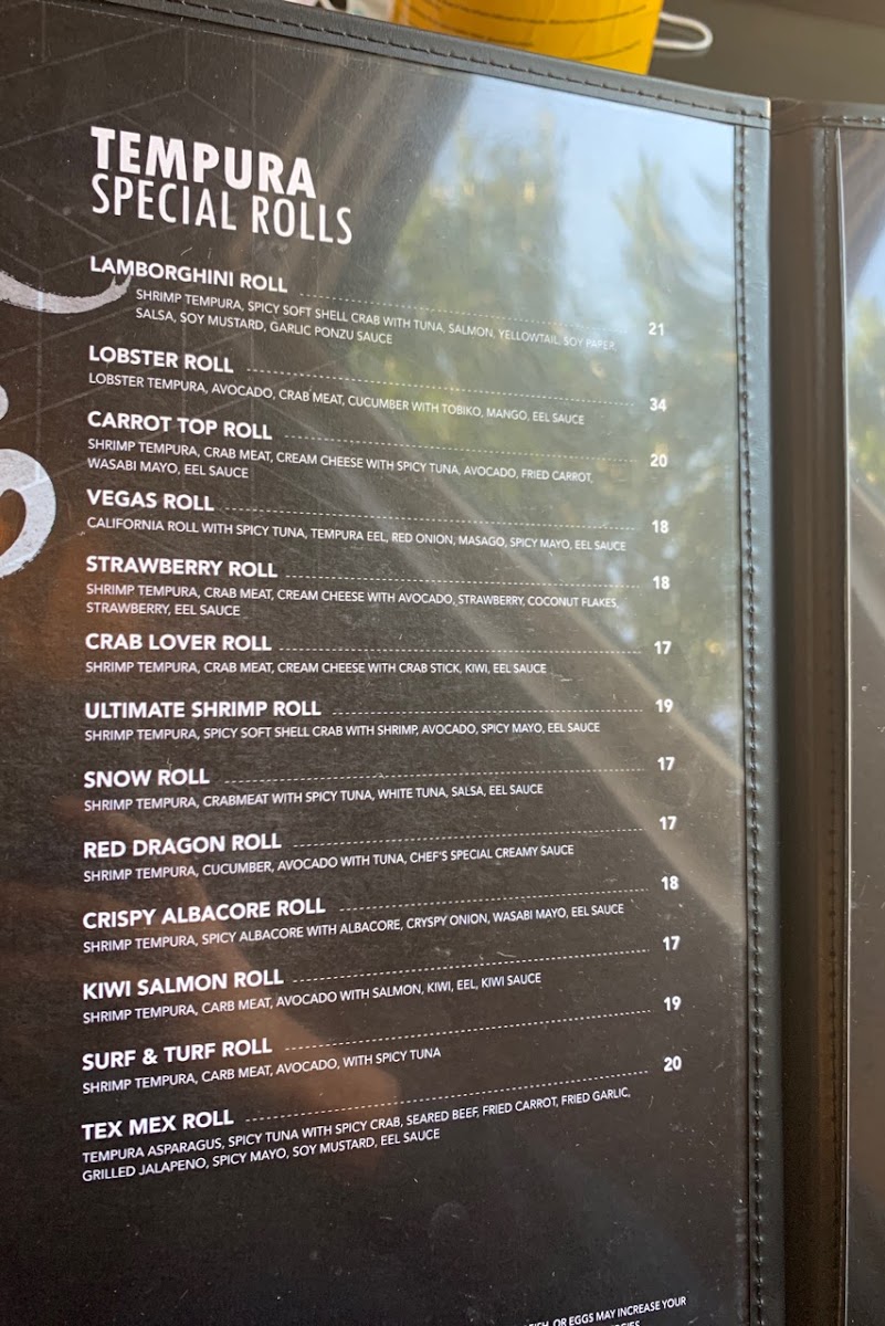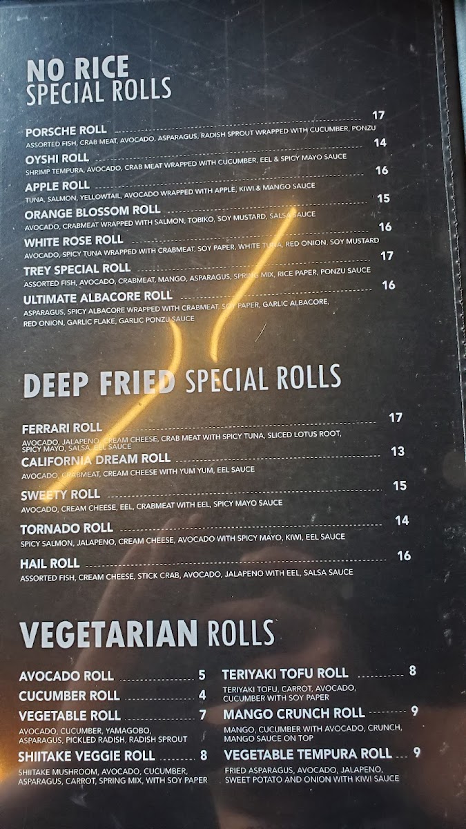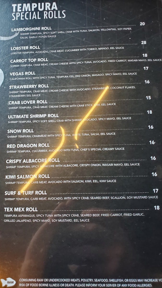 Shrimp tempura, crab meat, cream cheese with spicy tuna, avocado, fried carrot, wasabi mayonnaise, and eel sauce.