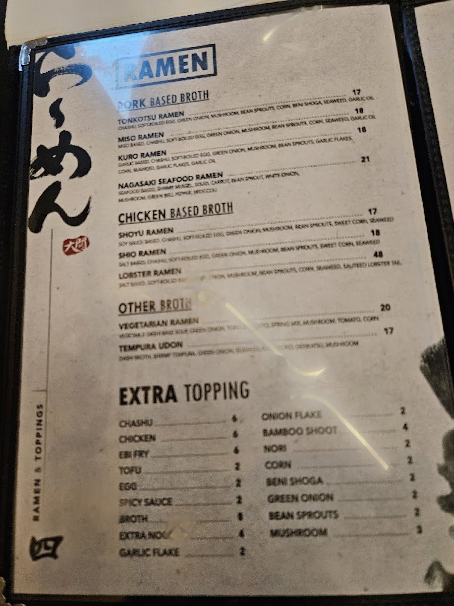 Garlic based, chashu, soft-boiled egg, scallion, mushroom, bean sprouts, garlic flakes, corn, seaweed, garlic flakes, garlic oil.